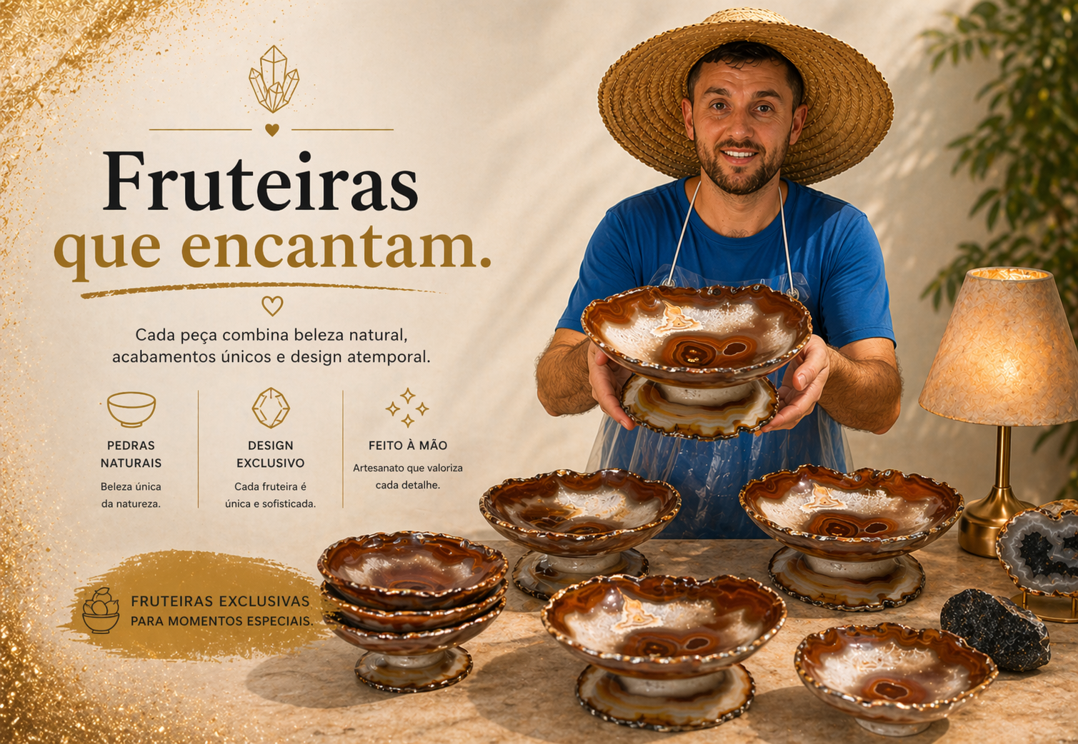 Fruteira Luxo de Ágata Natural com Pedestal Dourado