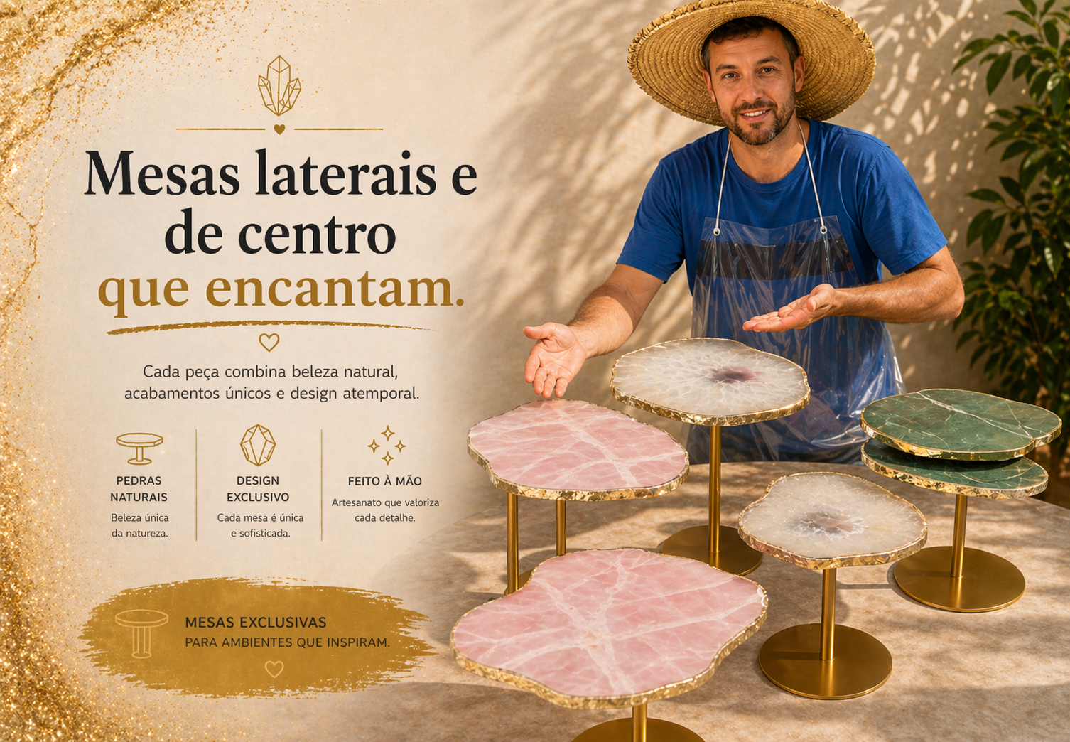 Mesa de Centro Ágata Rosa com Pedestal Dourado